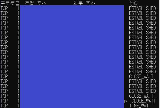 | TIME_WAIT | 이미 해당 사이트와 연결이 종료되었거나 다음 연결을 위해 기다리는 상태 |