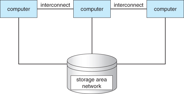 - 저장장치를 공유, 빠른 속도의 랜이나 InfinitBand와 같은 고속의 상호 연결망으로 연결